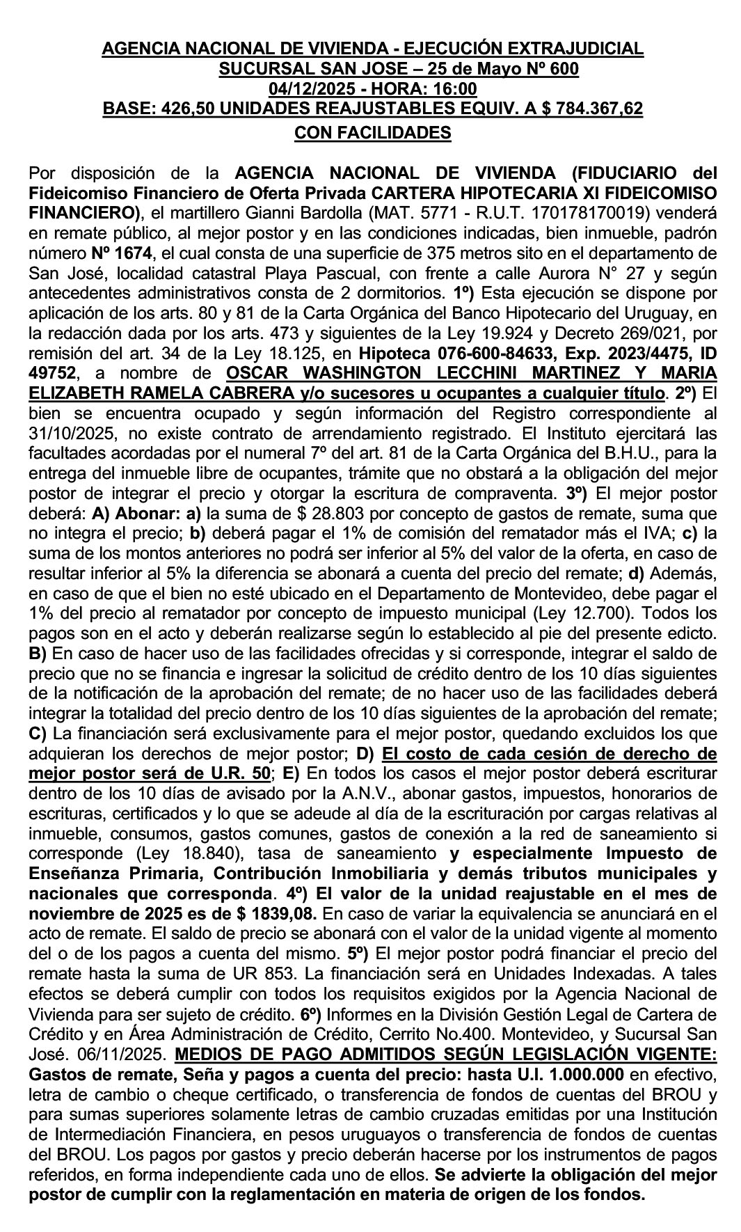 Por disposición de la AGENCIA NACIONAL DE VIVIENDA (FIDUCIARIO del Fideicomiso Financiero de Oferta Privada CARTERA HIPOTECARIA XI FIDEICOMISO FINANCIERO), el martillero Gianni Bardolla (MAT. 5771 - R.U.T. 170178170019) venderá en remate público, al mejor postor y en las condiciones indicadas, bien inmueble, padrón número Nº 1674, el cual consta de una superficie de 375 metros sito en el departamento de San José, localidad catastral Playa Pascual, con frente a calle Aurora N° 27 y según antecedentes administrativos consta de 2 dormitorios. 1º) Esta ejecución se dispone por aplicación de los arts. 80 y 81 de la Carta Orgánica del Banco Hipotecario del Uruguay, en la redacción dada por los arts. 473 y siguientes de la Ley 19.924 y Decreto 269/021, por remisión del art. 34 de la Ley 18.125, en Hipoteca 076-600-84633, Exp. 2023/4475, ID 49752, a nombre de OSCAR WASHINGTON LECCHINI MARTINEZ Y MARIA ELIZABETH RAMELA CABRERA y/o sucesores u ocupantes a cualquier título. 2º) El bien se encuentra ocupado y según información del Registro correspondiente al 31/10/2025, no existe contrato de arrendamiento registrado. El Instituto ejercitará las facultades acordadas por el numeral 7º del art. 81 de la Carta Orgánica del B.H.U., para la entrega del inmueble libre de ocupantes, trámite que no obstará a la obligación del mejor postor de integrar el precio y otorgar la escritura de compraventa. 3º) El mejor postor deberá: A) Abonar: a) la suma de $ 28.803 por concepto de gastos de remate, suma que no integra el precio; b) deberá pagar el 1% de comisión del rematador más el IVA; c) la suma de los montos anteriores no podrá ser inferior al 5% del valor de la oferta, en caso de resultar inferior al 5% la diferencia se abonará a cuenta del precio del remate; d) Además, en caso de que el bien no esté ubicado en el Departamento de Montevideo, debe pagar el 1% del precio al rematador por concepto de impuesto municipal (Ley 12.700). Todos los pagos son en el acto y deberán realizarse según lo establecido al pie del presente edicto. B) En caso de hacer uso de las facilidades ofrecidas y si corresponde, integrar el saldo de precio que no se financia e ingresar la solicitud de crédito dentro de los 10 días siguientes de la notificación de la aprobación del remate; de no hacer uso de las facilidades deberá integrar la totalidad del precio dentro de los 10 días siguientes de la aprobación del remate; C) La financiación será exclusivamente para el mejor postor, quedando excluidos los que adquieran los derechos de mejor postor; D) El costo de cada cesión de derecho de mejor postor será de U.R. 50; E) En todos los casos el mejor postor deberá escriturar dentro de los 10 días de avisado por la A.N.V., abonar gastos, impuestos, honorarios de escrituras, certificados y lo que se adeude al día de la escrituración por cargas relativas al inmueble, consumos, gastos comunes, gastos de conexión a la red de saneamiento si corresponde (Ley 18.840), tasa de saneamiento y especialmente Impuesto de Enseñanza Primaria, Contribución Inmobiliaria y demás tributos municipales y nacionales que corresponda. 4º) El valor de la unidad reajustable en el mes de noviembre de 2025 es de $ 1839,08. En caso de variar la equivalencia se anunciará en el acto de remate. El saldo de precio se abonará con el valor de la unidad vigente al momento del o de los pagos a cuenta del mismo. 5º) El mejor postor podrá financiar el precio del remate hasta la suma de UR 853. La financiación será en Unidades Indexadas. A tales efectos se deberá cumplir con todos los requisitos exigidos por la Agencia Nacional de Vivienda para ser sujeto de crédito. 6º) Informes en la División Gestión Legal de Cartera de Crédito y en Área Administración de Crédito, Cerrito No.400. Montevideo, y Sucursal San José. 06/11/2025. MEDIOS DE PAGO ADMITIDOS SEGÚN LEGISLACIÓN VIGENTE: Gastos de remate, Seña y pagos a cuenta del precio: hasta U.I. 1.000.000 en efectivo, letra de cambio o cheque certificado, o transferencia de fondos de cuentas del BROU y para sumas superiores solamente letras de cambio cruzadas emitidas por una Institución de Intermediación Financiera, en pesos uruguayos o transferencia de fondos de cuentas del BROU. Los pagos por gastos y precio deberán hacerse por los instrumentos de pagos referidos, en forma independiente cada uno de ellos. Se advierte la obligación del mejor postor de cumplir con la reglamentación en materia de origen de los fondos.