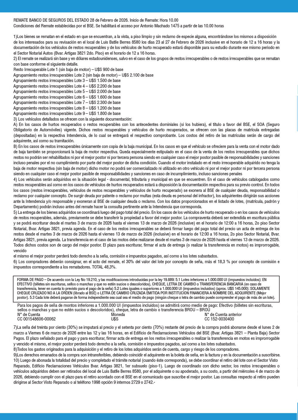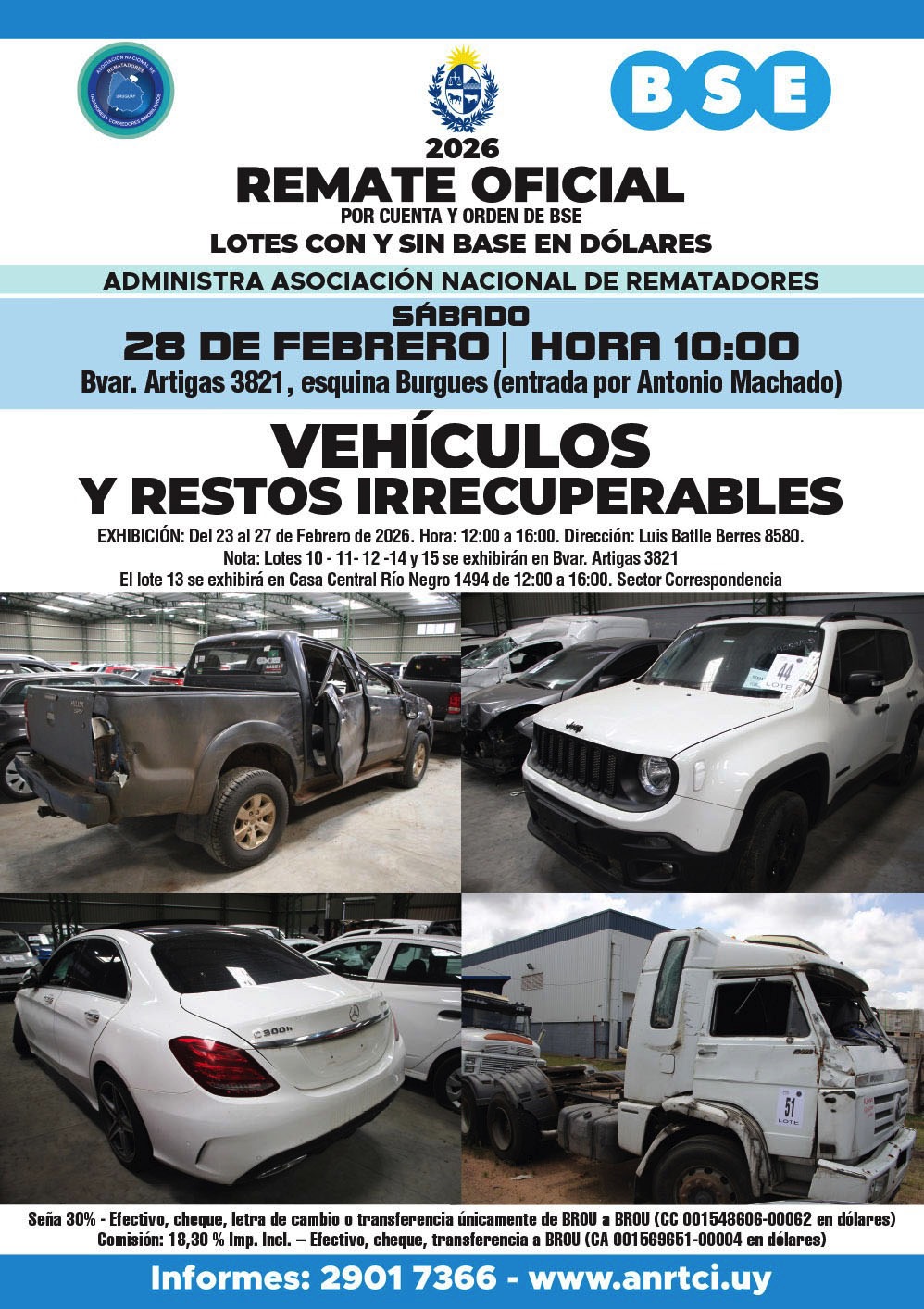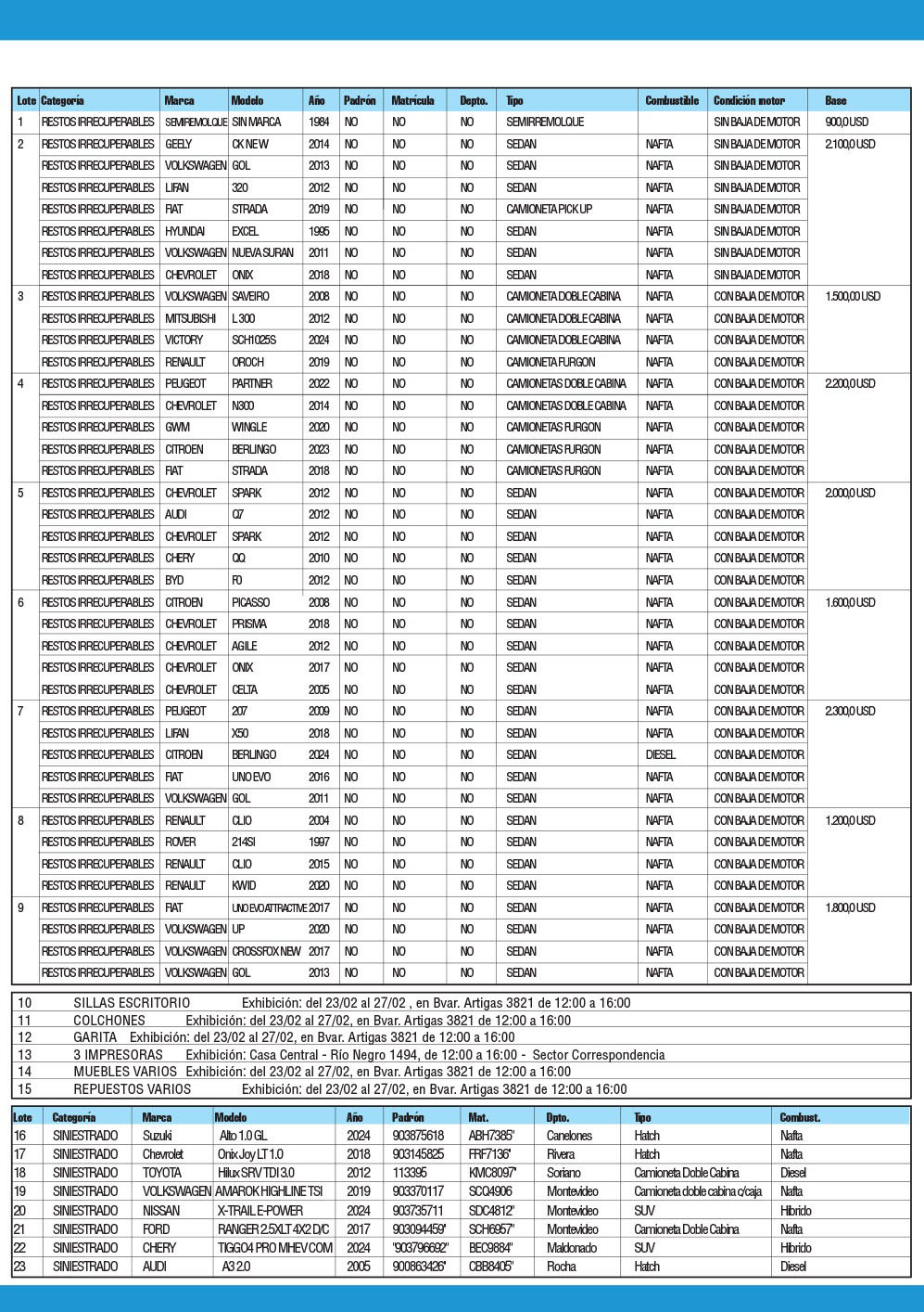 Los bienes a rematar estarán disponibles para ser visitados por parte de los interesados desde el día Martes 24 de hasta el día viernes 27 de febrero (inclusive), desde la hora 12:00 a la hora 16:00, en calle Luis Batlle Berres 8580, Montevideo.